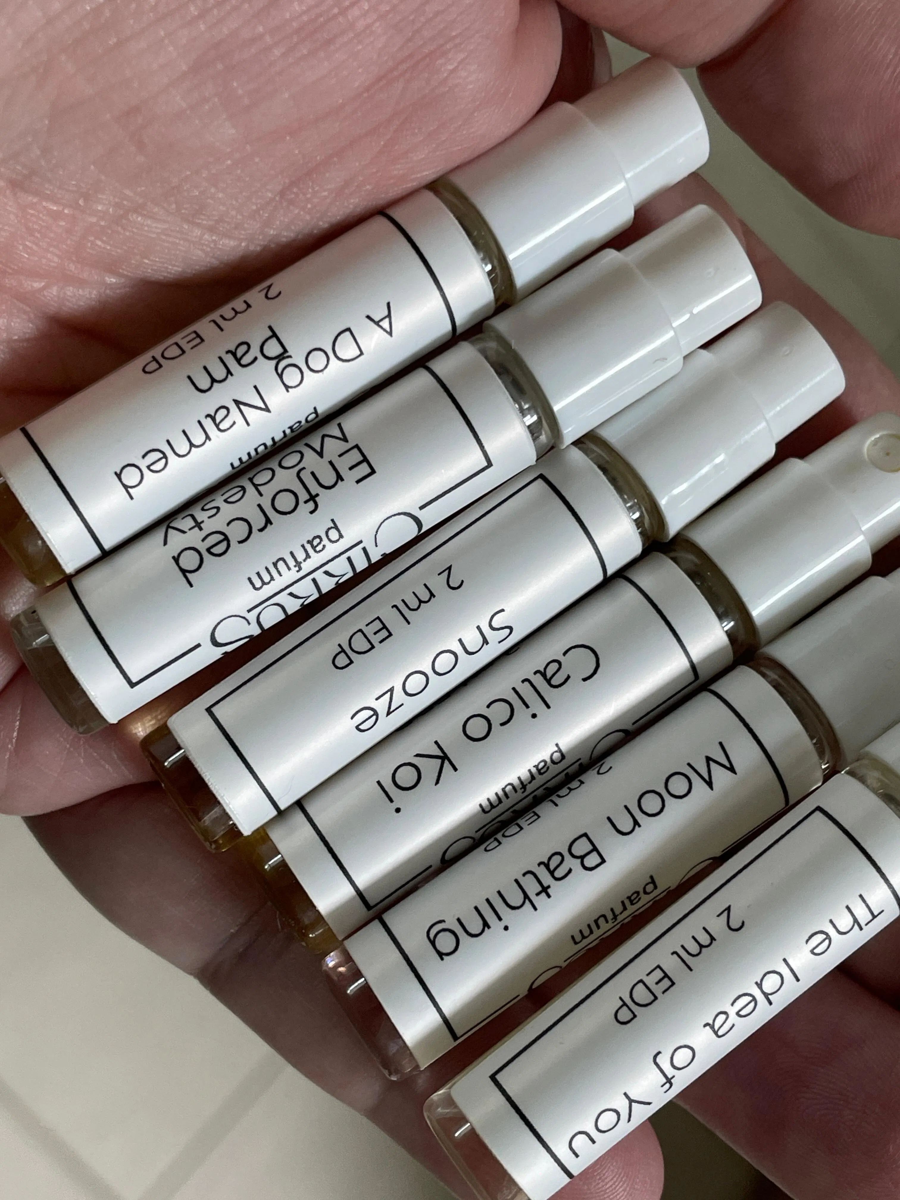 I ordered the trial set because I wasn’t sure which scent I wanted to get. These are all very lovely, artistic takes on perfume. I liked all of the scents in my set, but am in love with enforced modesty and snooze. I’m going to order another sample set now so I can try five new scents!